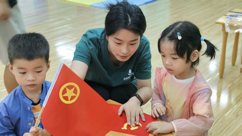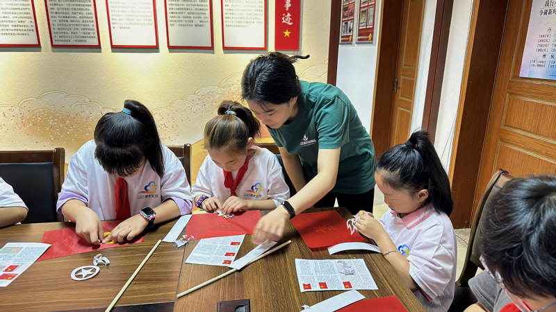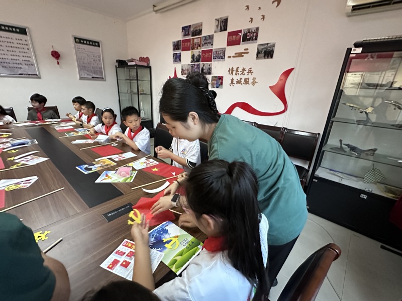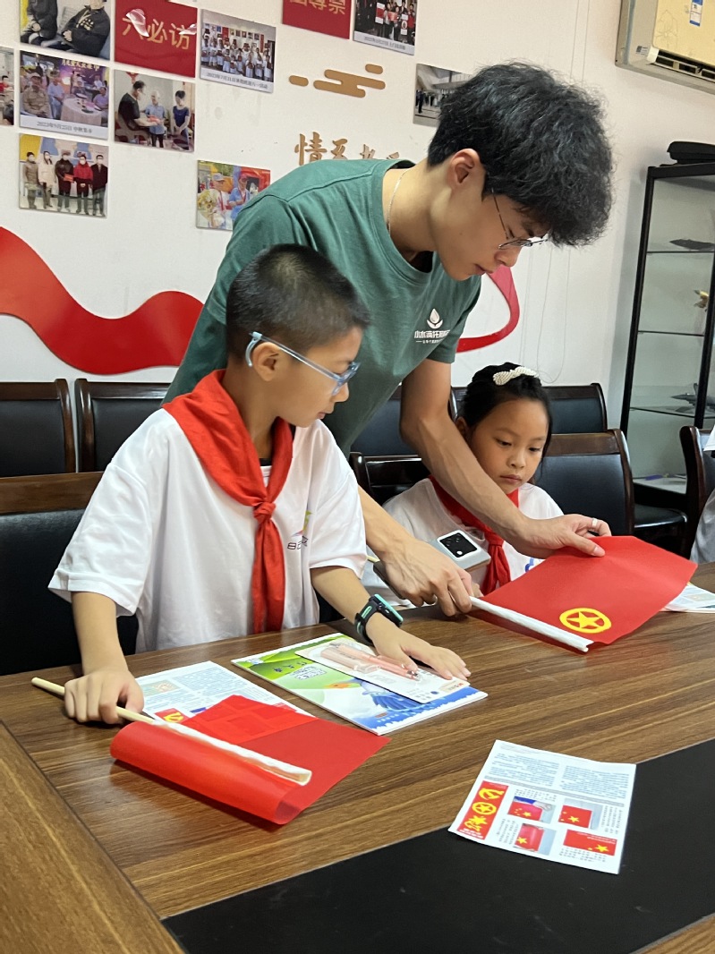 用心开展“实践课”。“以‘劳’为美,童心守望”七彩假期暑托行实践团发挥婴幼儿托育专业特色,在白云社区和校内暑期教职工子女托管班,都以身临其境的体验课程形式教会孩子们制作国旗、党旗、团旗、少先队旗等手工作品,并且科普它们的构成、由来和深刻涵义。学生志愿者不仅向孩子们介绍手工制作的方法和注意要点,而且教会孩子们如何用材料和工具进行正确地摆放和粘贴,在团队师生的指导下,一件件精美的作品在小朋友们指尖诞生。