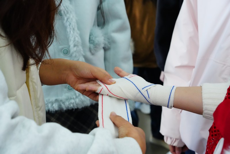 随后,24幼儿661班吕彤彤与蔡雨婷分别就日常生活中常见的创伤包扎与骨折固定技术进行了专项教学。她们聚焦常见意外伤害的处置,利用专业教具,现场演示了针对不同部位伤口的多种包扎方法。在实操练习环节,两位指导同学耐心巡视,逐一纠正学员们在手法、力度、顺序上的偏差,确保每位参与者都能掌握操作要领。