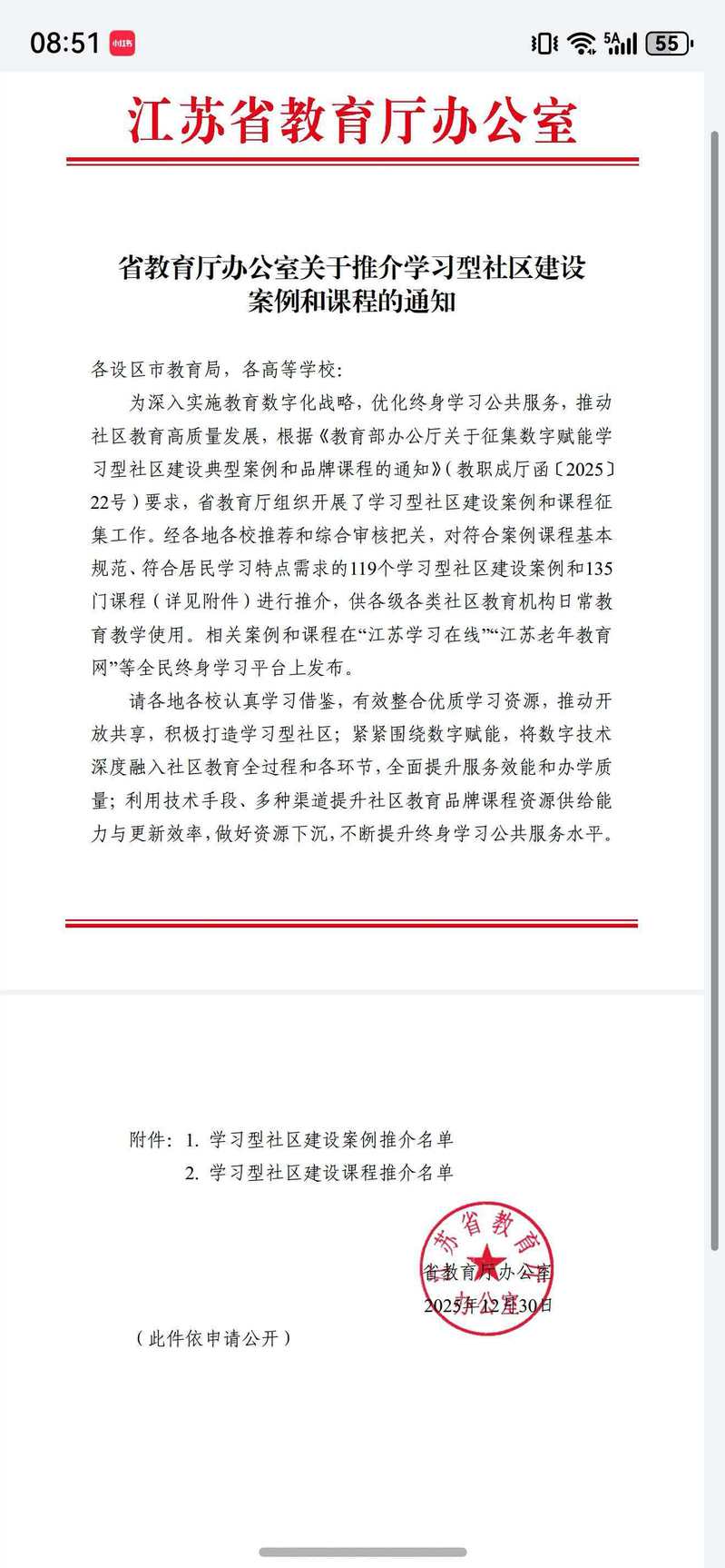 此次入选,是对我院社区教育实践成果的高度肯定。我院将以此为契机,持续深化校社联动,推动优质资源开放共享,为构建高质量学习型社区贡献更多智慧与力量!