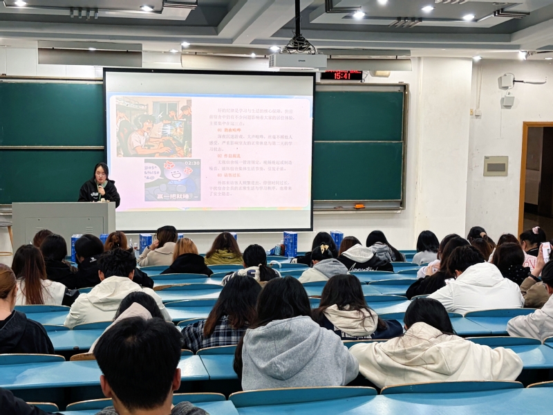 随后,自律会干事汪宇萌从多个维度对公寓文明建设作了系统阐述。她突出强调了宿舍用电用水安全,提醒同学们规范使用电器设备,杜绝私拉乱接、人走不断电等危险行为。在人际沟通方面,建议同学们学会换位思考、互相尊重,遇到矛盾及时沟通解决。针对违规饲养宠物,她结合校纪校规予以明确禁止,指出其存在的健康与安全隐患,要求全体同学严格遵守规定。