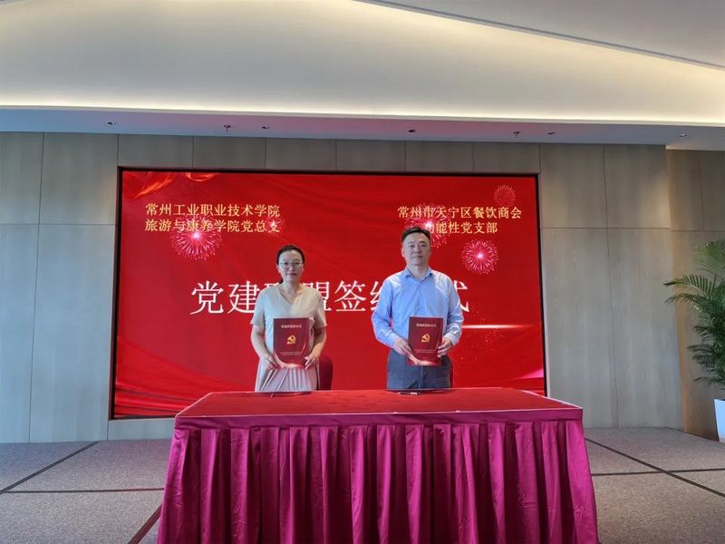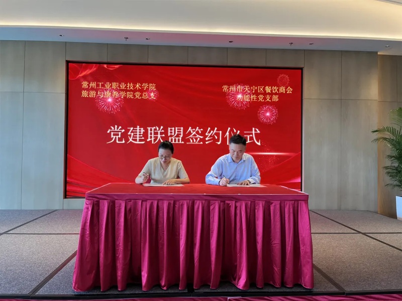 7月1日上午,应常州市天宁区餐饮商会邀请,旅游与康养学院党总支副书记郭媛及相关党员教师参加商会的党建共建活动,并代表旅游与康养学院党总支与常州市天宁区餐饮商会功能性党支部联合举行了党建联盟签约仪式。双方旨在通过党建联盟共建,围绕人才培养、课题研发等方面建立更深的合作交流基础,实现双方共赢。