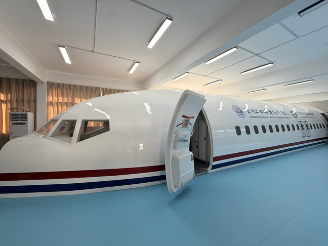 本次建成的民航客舱实训中心,是校企双方深度合作的结晶,严格按照真实民航客舱环境设计与建造,核心设备为一架1:1复原的波音B737-800型客机模拟舱。模拟舱不仅完整配备了旅客座椅、行李架、餐车等基础设施,更搭载了先进的客舱服务训练设备、应急撤离训练系统及舱门训练器。