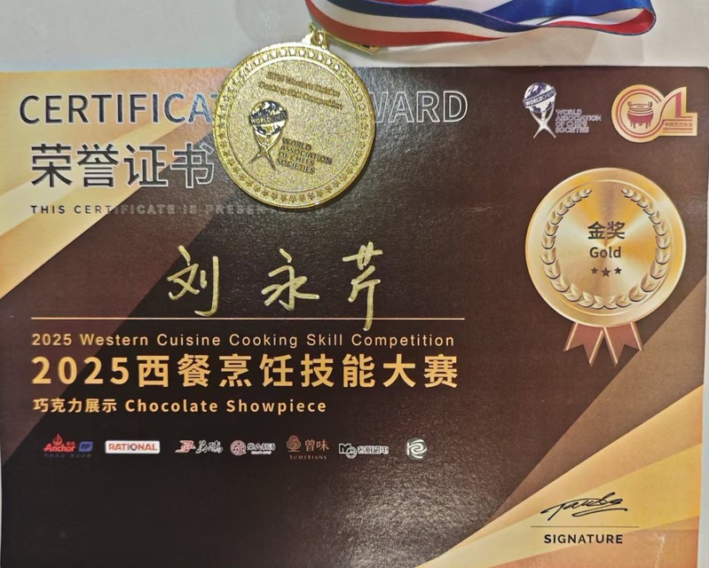 2025年10月18日,她在中国烹饪协会和世界厨师联合会在苏州举办“2025西餐烹饪技能大赛”中,参加“巧克力展评”项目,一举夺得金奖。