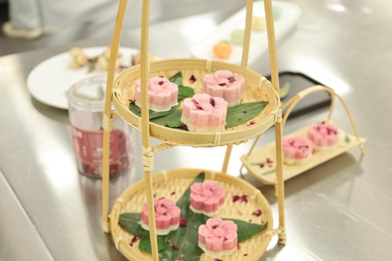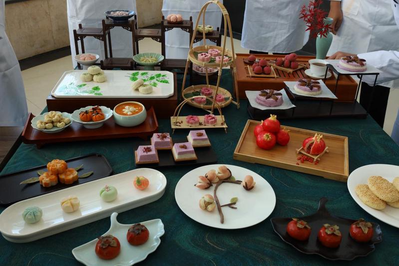 面点展示区,则如同一场融合了节气文化与养生智慧的艺术展。从皮重、馅心都严格标准的“冠顶饺”“秋叶饺”等传统花式蒸饺,到造型逼真、寓意吉祥的“白菜饺”,学生们精湛的捏塑技艺令人赞叹。更值得一提的是创意养生茶点系列:“茯苓玫瑰糕”巧妙运用药食同源理念,“桂花酒酿饼”浸润着秋日韵味,“柿子山药糕”则集绵密与清甜于一体。这些作品以色、香、味、形为载体,让节气养生理念在舌尖优雅绽放,全面展现了高职学子在面点工艺与营养学结合上的创新与实践能力。