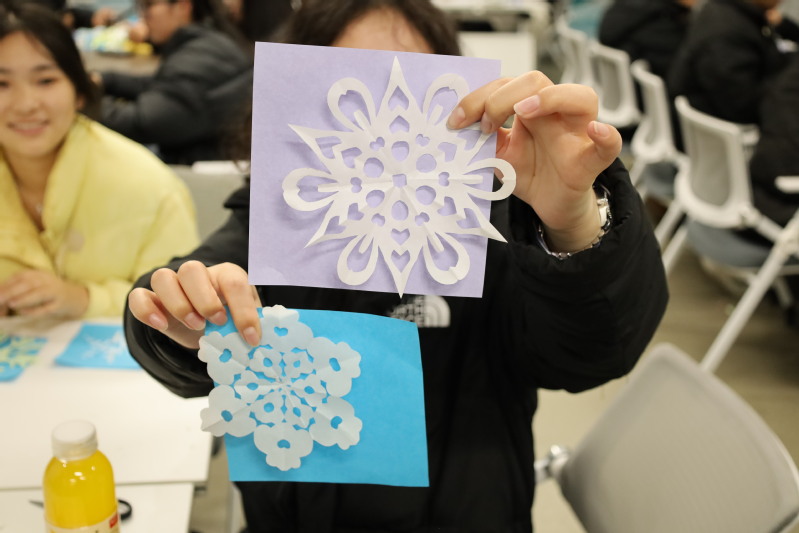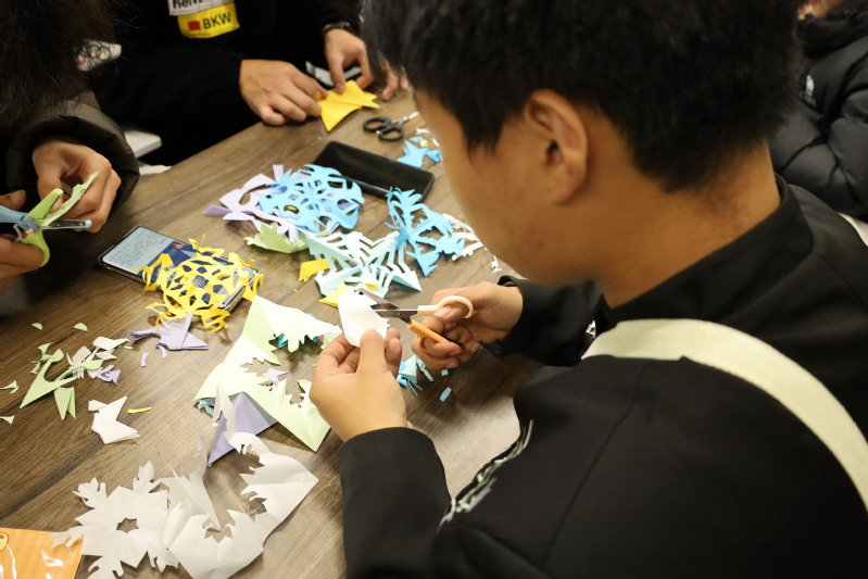 巧手剪雪花,温情暖寒冬。学院组织学生干部和部分家庭经济困难同学开展创意手作活动。活动现场,同学们在轻松愉快的氛围中学习剪纸技巧,一张张彩纸在指尖翻飞,化作一幅幅精美的雪花图案。此次活动将传统美育与心理关怀相结合,旨在通过动手实践缓解学子压力,培养审美情趣,让资助工作从经济支持延伸到精神滋养,以润物细无声的方式,为冬日的校园增添了一份指尖上的温暖与创意。