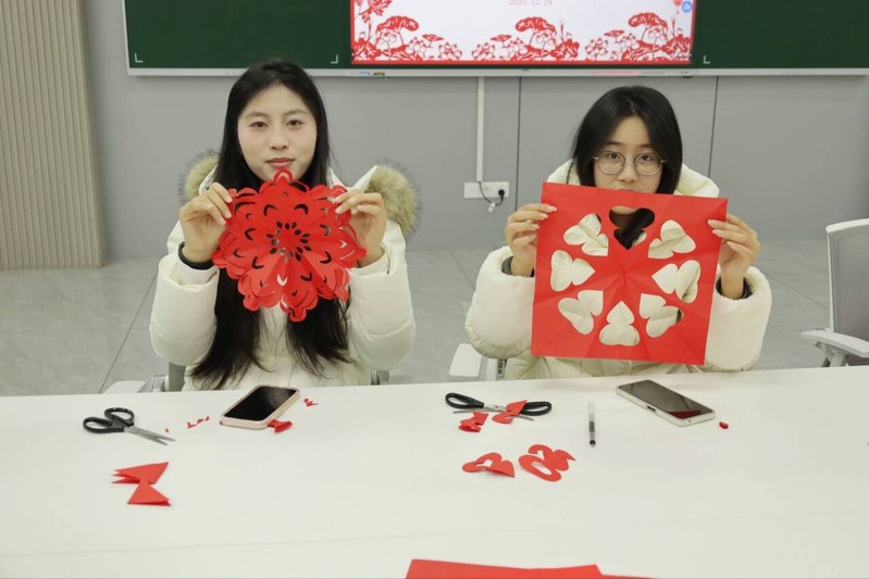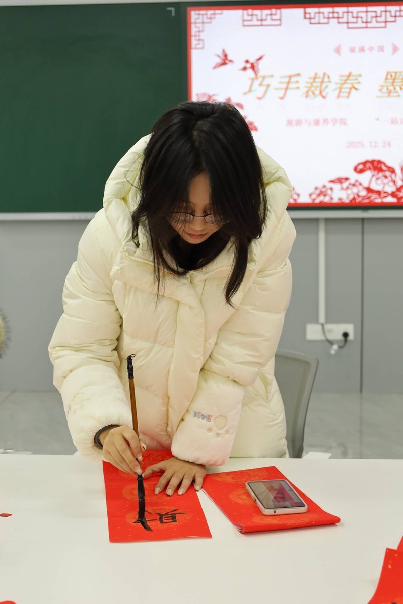为弘扬中华优秀传统文化,营造喜庆祥和的新年氛围,深化“一站式”学生社区育人内涵,12月24日下午,旅游与康养学院于“一站式”学生社区活动空间成功举办了“巧手裁春,墨韵迎福”主题迎新年活动。学院辅导员老师、学生代表与物业宿管人员欢聚一堂,通过亲手剪窗花、写春联,共同迎接2026年的到来。