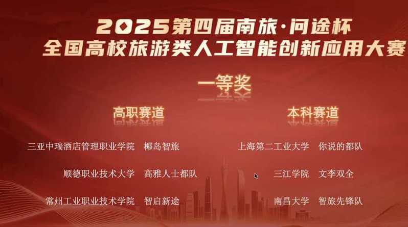 2025年12月28日,由江苏省文化旅游职业教育行业指导委员会、江苏旅游职业教育集团、南京旅游职业学院和广州市问途信息技术有限公司共同主办的第四届“南旅•问途杯全国高校旅游类人工智能创新应用大赛圆满落幕。由我校旅游与康养学院酒店管理与数字化运营专业陈嘉铭、刘佳、高思佳及孙荟4位同学组成的“智启新途”队获高职组一等奖,戴新潼、董原荣、卜文茹及耿尚悠4位同学组成的“东方不败”队获高职组优秀奖。白娟和卢帅两位教师获“优秀指导老师奖”。