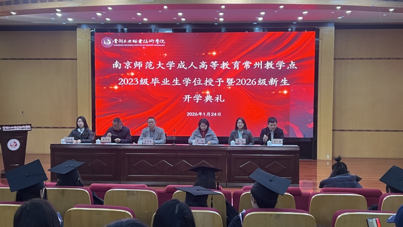2026年1月24日上午,南京师范大学成人高等教育常州工业职业技术学院教学点2023级毕业生学位授予暨2026级新生开学典礼在我校隆重举行。常州工业职业技术学院党委委员、组织部部长王迎春,南京师范大学继续教育学院成教办主任李敏,常州工业职业技术学院继续教育管理处处长黄伟福,旅游与康养学院党总支书记陈纯、院长刘加凤与2023级学位获得者、2026级新生齐聚一堂,共同见证这一荣耀与希望典礼。本次典礼由张卫兵主持。
