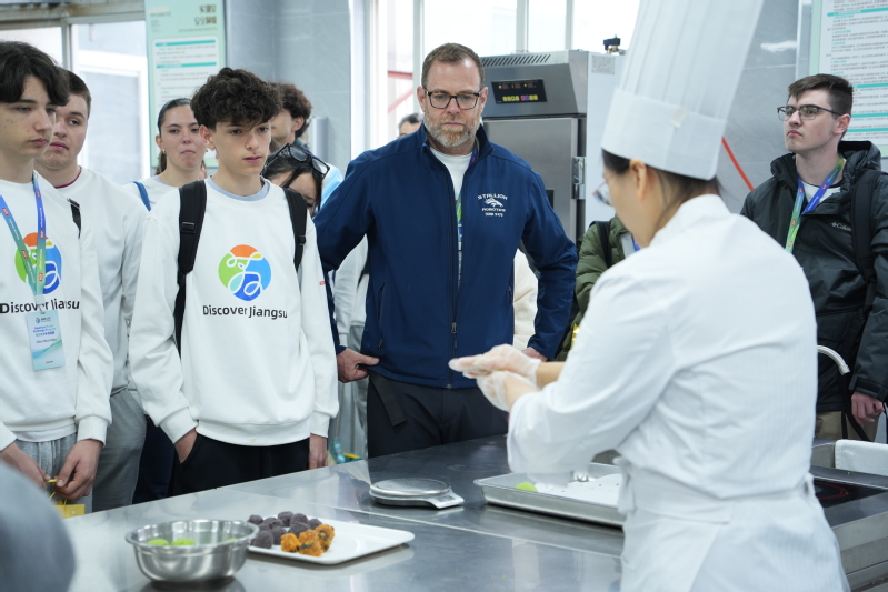 美国中学生兴致勃勃投入实践,揉制面团、包入馅料、塑造造型,虽动作生疏却饱含热情。旅游与康养学院烹饪专业学生主动提供协助,一边示范操作,一边用简单英语讲解技巧,中外学生默契配合、互动协作,在指尖互动中拉近彼此距离。该实训室配备先进设备,可满足多组教学实训需求,既是烹饪专业学生技能培养的重要支撑,也是向中外访客展示常州美食文化的重要平台。